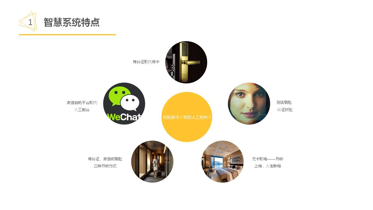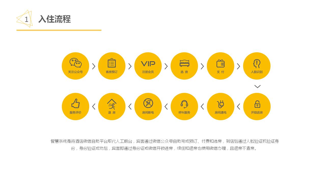 将酒店微信自助平台取代人工前台,宾客通过微信公众号自助完成预订、付费和选房,到店后通过人脸验证机验证身份,身份验证成功后,宾客即通过身份证或微信开锁进房,续住和退房也使用微信办理,且退房不查房。