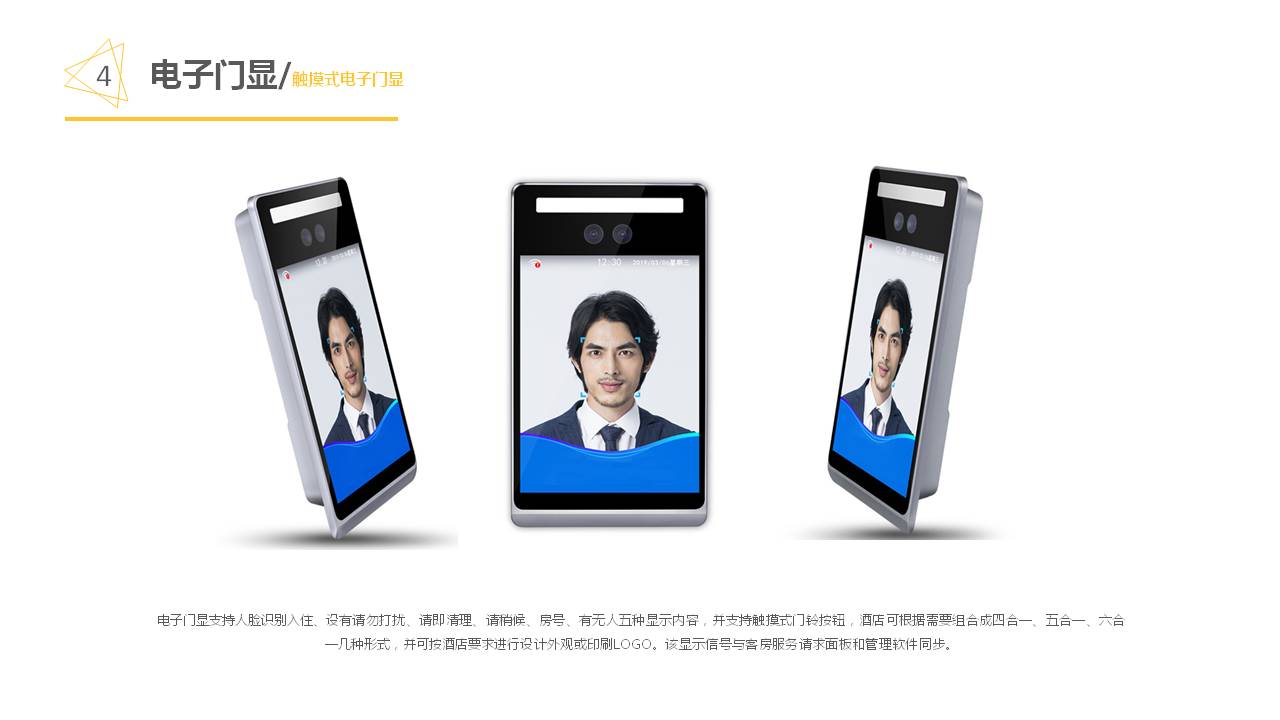 电子门显支持人脸识别入住、设有请勿打扰、请即清理、请稍候、房号、有无人五种显示内容,并支持触摸式门铃按钮,酒店可根据需要组合成四合一、五合一、六合一几种形式,并可按酒店要求进行设计外观或印刷LOGO。该显示信号与客房服务请求面板和管理软件同步。