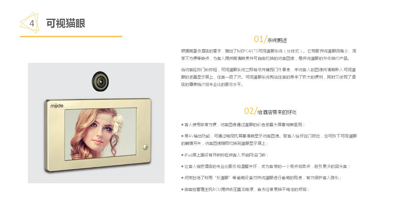 根据高星级酒店的需求,推出了MEPC437S可视猫眼系统(分体式)。它克服传统猫眼视角小、观察不方便等缺点,为客人提供高清晰度并可自由切换的访客图像,是传统猫眼的升级换代产品。