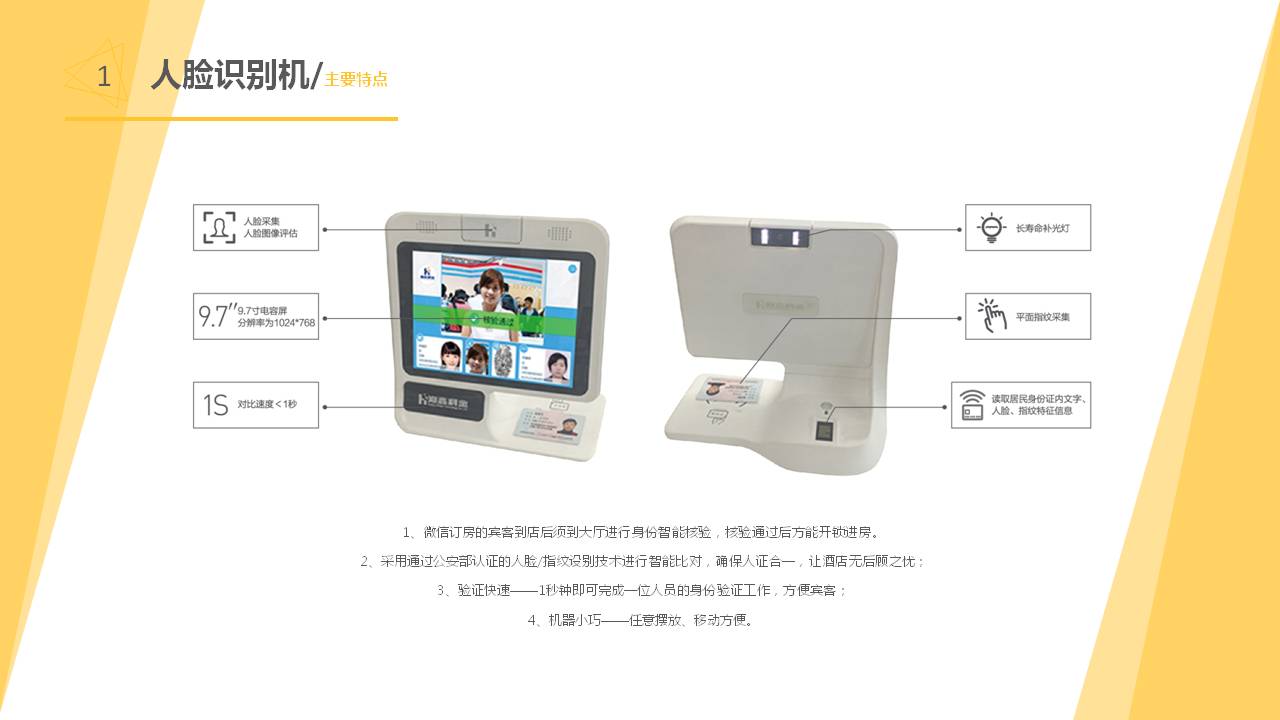 2、采用通过公安部认证的人脸/指纹设别技术进行智能比对,确保人证合一,让酒店无后顾之忧;
